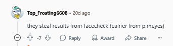 While some Redditors have claimed it is simply reselling FaceCheck results, we ran searches against it using faces that have been removed from FaceCheck results. These removed results still appeared on FaceSeek, which would be impossible if they simply resold results from FaceCheck. This test is important because having the same results from two tools does not always mean they are stealing from one another; it could just be that their coverage is very similar. This test, however, does not preclude the possibility that FaceSeek has stolen FaceCheck’s private database of scraped faces + source URLs, or any other possible explanation.