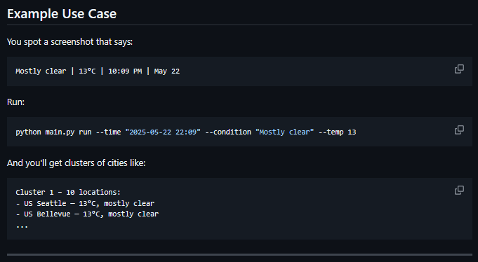 People post screenshots with the Windows weather widget in their taskbar all the time, showing the exact temperature, weather condition, and local time. This tool uses the same API as the widget to find cities where those conditions are currently true.