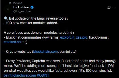 lolarchiver, an emerging top competitor to tools like OSINT Industries and Epieos, has recently added support for an additional 100+ sites, including infrequently supported sites like KiwiFarms, Exploit.in, etc. They also expressed plans to add username search support for over 400 sites over the next couple of months!