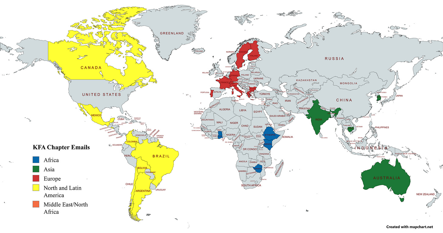 Below is a chart that shows the 26 KFA chapter emails that are associated with their respective country. The emails are divided by their respective country and region. Europe has the most KFA chapter emails (9), followed by North and Latin America (8), with Africa and Asia having four chapter emails. The KFA Palestine chapter email is the only one associated with the Middle East/North Africa region.