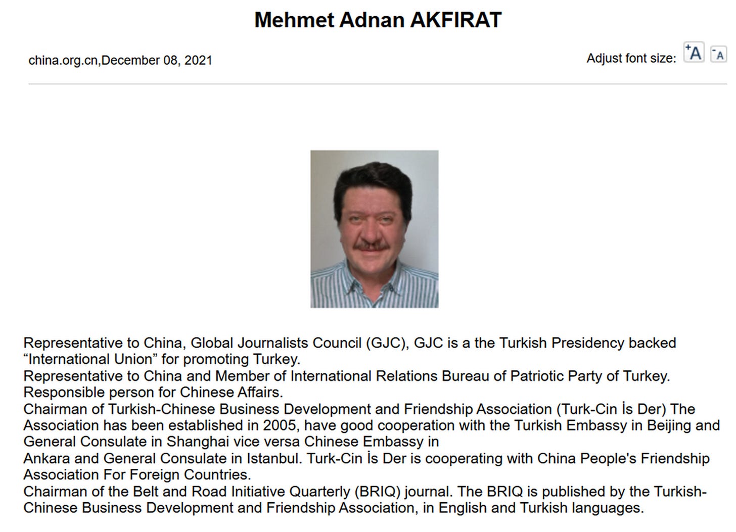Mehmet Adnan Akfirat is a member of the KFA's Turkey chapter and holds several positions at Chinese-Turkish associations and companies. Akfirat is the vice chairman at China-Turkiye Trade Development (Xinjiang) Co. Ltd. and the owner of the Turkish-Chinese Business Matching Center (TUCEM). He is a visiting fellow at Shanghai University’s Center for Turkish Studies and chairman of the Turkish Chinese Business Development and Friendship Association (Türk-Çin İş Der). Türk-Çin İş Der has substantial ties to the China People's Friendship Association for Foreign Countries (CPAFFC), a Chinese organization that promotes diplomacy and increased understanding between countries using people-to-people exchanges. However, the CPAFFC functions as a United Front organization for China, aiming to enhance its influence in various countries to further its objectives.