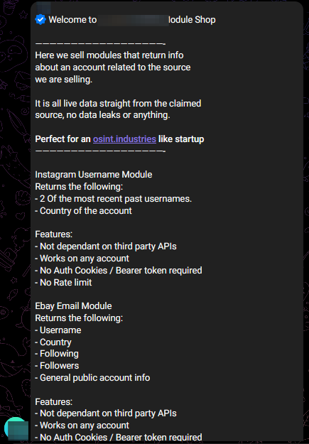 Edit: Earlier versions of this post included the as-of-then unconfirmed allegation that one of the module developers advertising in the underground OSINT marketplace was a former OSINT Industries developer. It has now been confirmed by OSINT Industries that this is not the case, as well as Epieos, another company the developer claimed to work for on their portfolio: